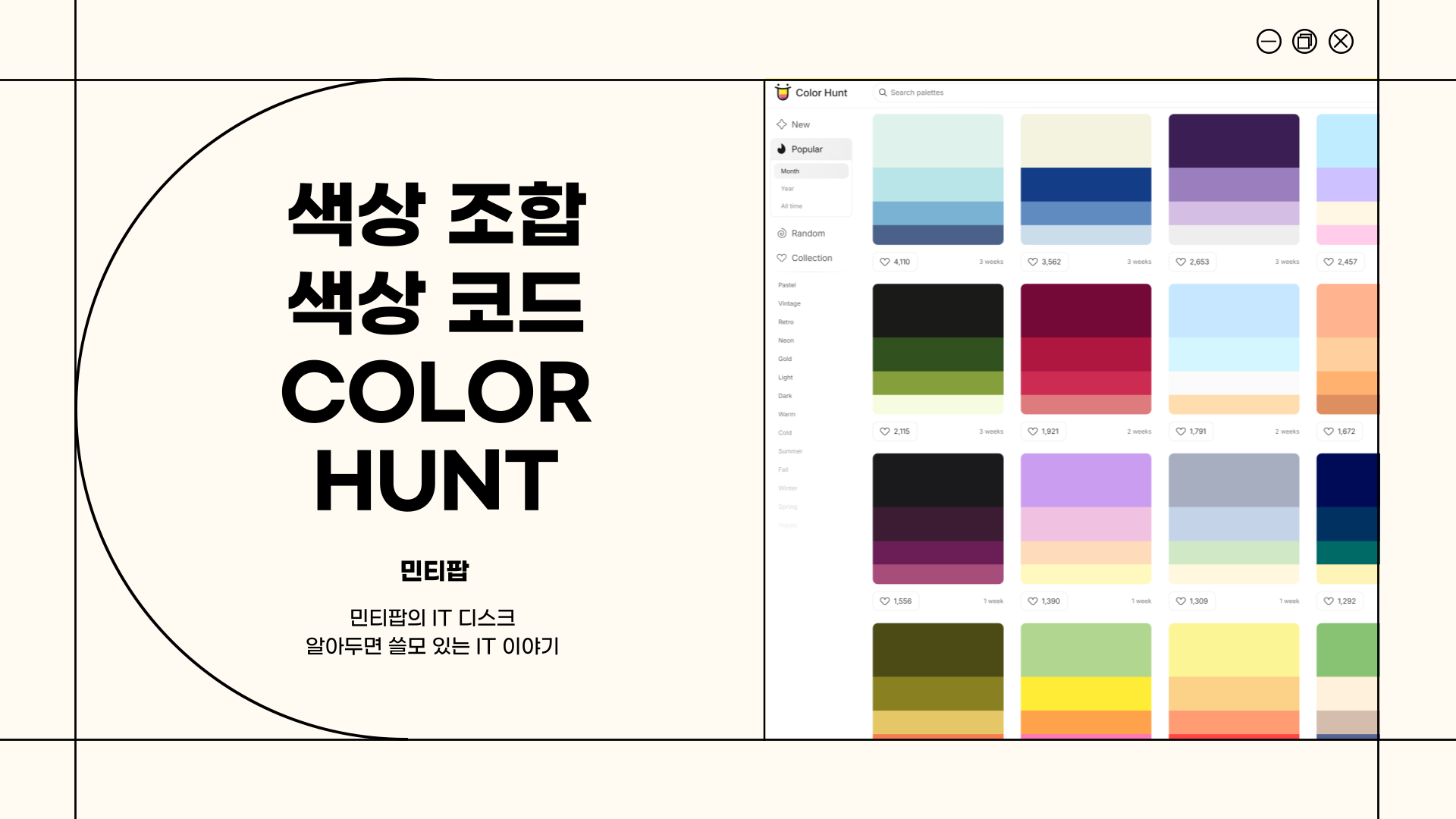 안녕하세요, 민티팝입니다! 오늘은 색감에 관심 있는 분들이라면 좋아할 만한 Color Hunt라는 멋진 사이트를 소개하려고 해요. 색상 조합이 중요하다고는 알지만, 막상 어떤 색을 어떻게 배치할지 고민할 때가 많죠? Color Hunt는 그런 고민을 확 덜어줄 수 있는 아주 유용한 도구랍니다.