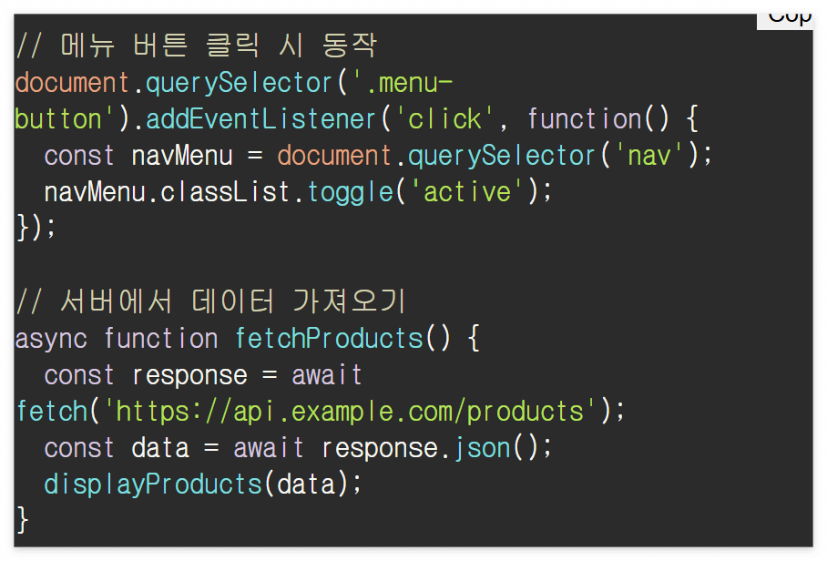 웹페이지에 동적인 기능을 추가하는 프로그래밍 언어입니다. 사용자 상호작용, 데이터 처리, 애니메이션 등을 구현합니다.